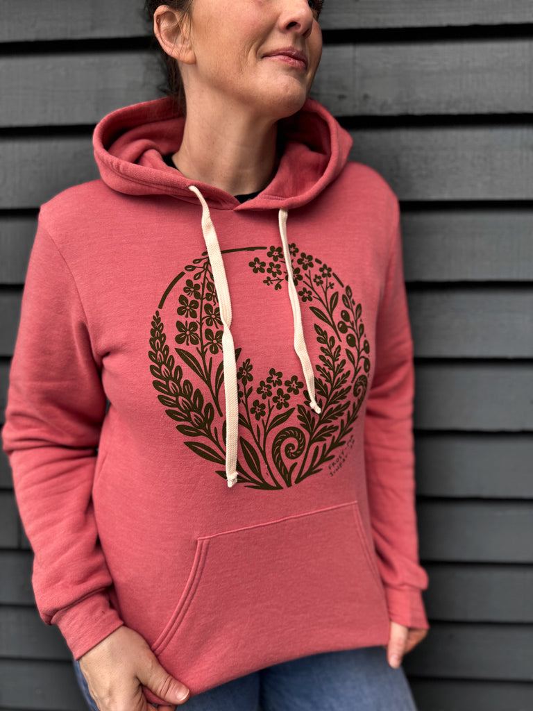 Flowers design printed in olive ink on a tri-desert rose unisex tri-blend fleece hoodie!