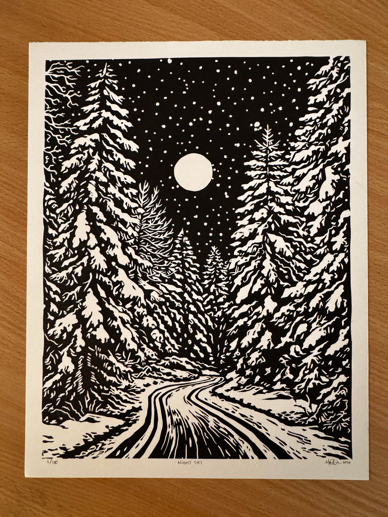 An original linocut relief print by Jessica Hahnlen inspired by night skiing in the Mendenhall Campground in Juneau, Alaska.